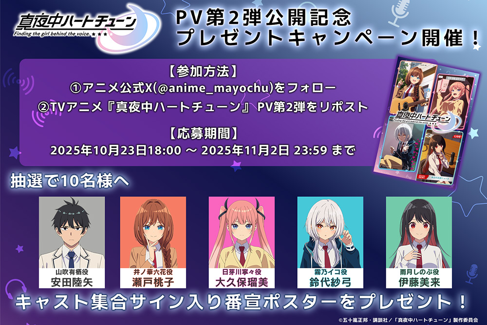 アニメ公式X(@anime_mayochu)のアカウントをフォロー、PV第2弾ポストをリポストしてくれた方の中から抽選で10名様に安田陸矢(有栖役)・瀬戸桃子(六花役)・大久保瑠美(寧々役)・鈴代紗弓(イコ役)・伊藤美来(しのぶ役)のキャスト集合サイン入り番宣ポスターをプレゼント!